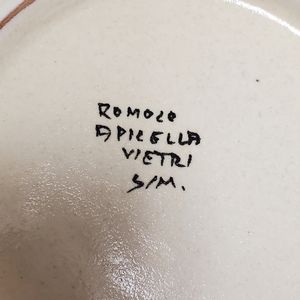 Beautifully handpainted Italian pottery Romolo Apicella Vietri dish with polka dotted birds along the rim.