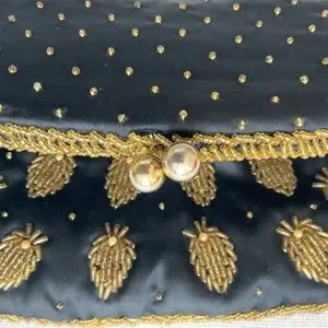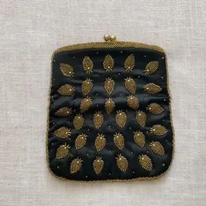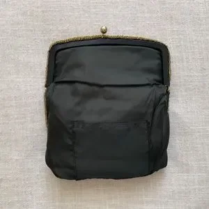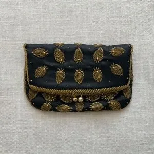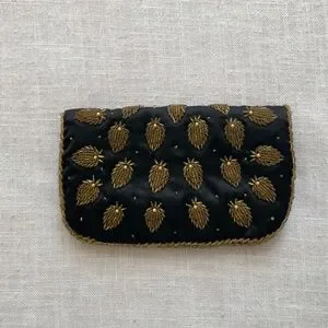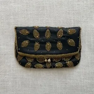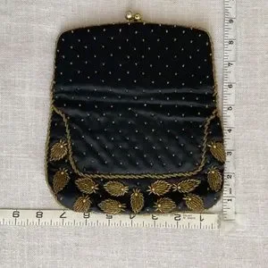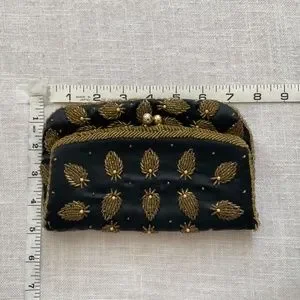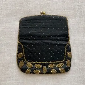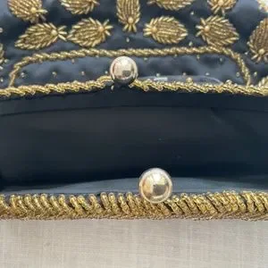 Beautiful black silk with gold beads fold over clutch, evening bag. black silk lining.Kiss lock(‘ball)closure.
