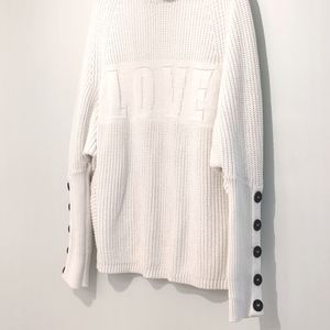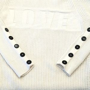 Long sleeve, batwing sleeve, high neck, button detailing, chunky knit, tonal slogan.