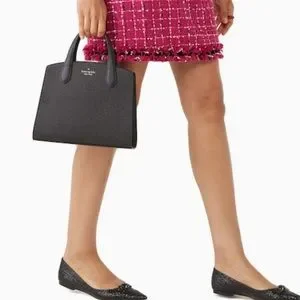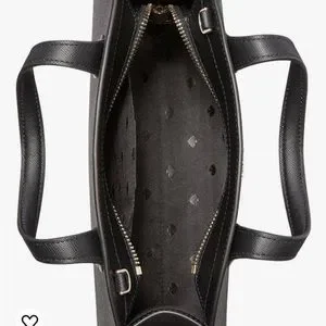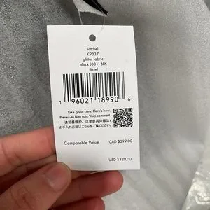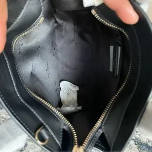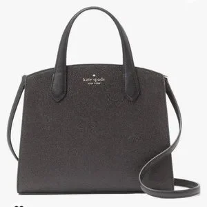 Measurements 8.8" H x 10.4 " W (bottom) x 3.68" D Handle Drop: 3.68" Features Strap Drop: 22" Metal Pinmount Logo Closure Type: drop in top zip closure Materials glitter fabric Trim: saffiano pvc trim imported