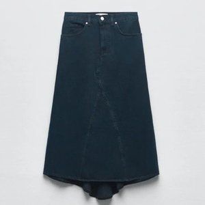NEW ZARA High-Rise Five-Pocket Denim Midi Fishtail Skirt Dark Navy Small