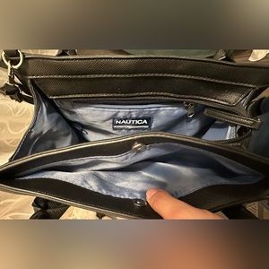 Nautica black cross body purse. Has blue interior lining. Interior is very clean. In excellent used condition with only some slight fraying on the strap.