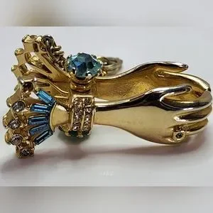 Vintage 1950 Bylle Co Clasped Hands Glove Holder Clip *Gold/Blue* EUC