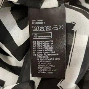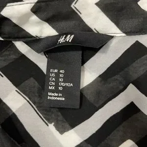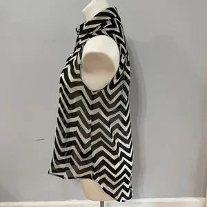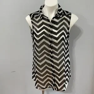 H&M Sleeveless Blouse in Black White with Chevron Pattern, Size 6. Button front, collared. 100% Polyester. Good condition.