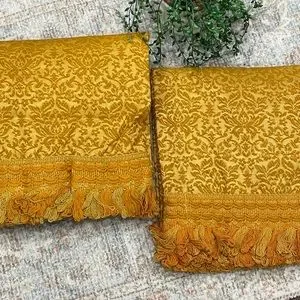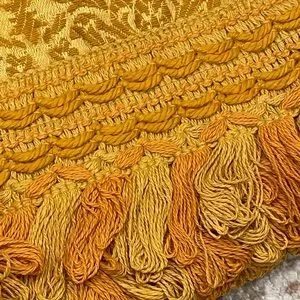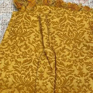 A pair of vintage goldenrod and orange curtains, pleated top, fringe bottoms, 18”W at top, 29”W at bottom, 43.5”L, in gently preowned condition.