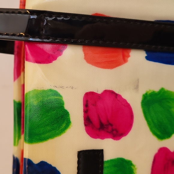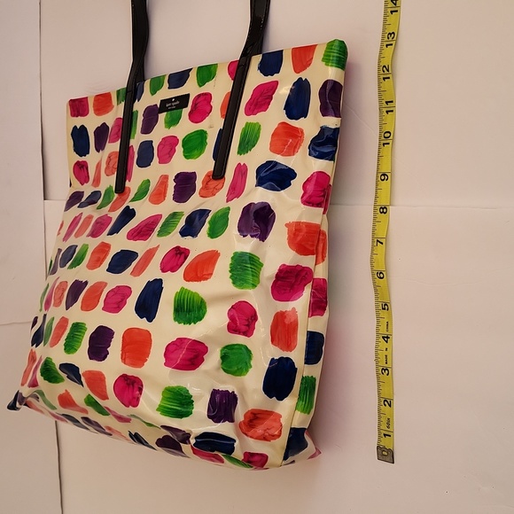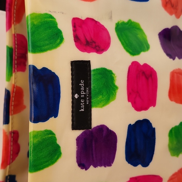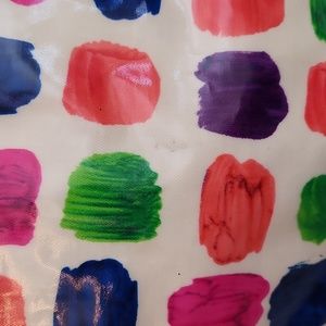 Cream colored bag with blue, purple, orange, pink, and green paint swatch pattern