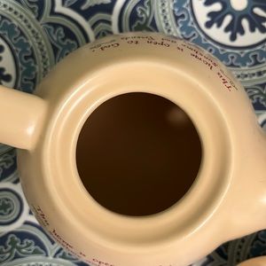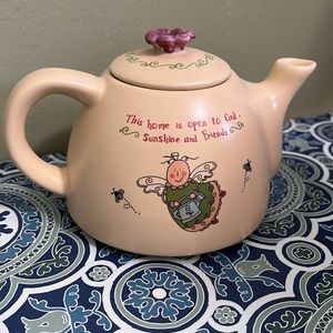 This is part of a set of cup and teapot, I do not have the cup which the teapot was able to be stacked on top. Still a cute piece for teapot collections. The teapot is a beige/cream color with green, purple, blue, red and pink colors. The design is a cute character with wings flying with a water can with bees.