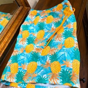 New men’s resort swim trunks. Size XXL. Tropical plants and pineapples. Aqua, orange and yellow. Tie at front. Four way stretch. Quick dry fabric. UPF 50 sun protection. Machine washable. Back pocket.