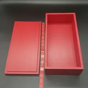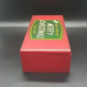 Restoration Hardware red wooden box green label with white and yellow lettering