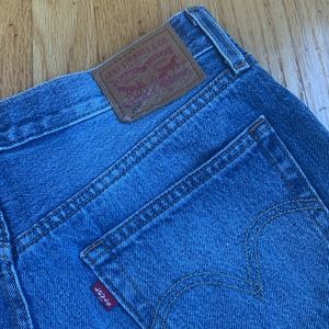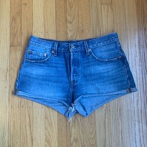 Levi’s Classic wash 501 denim cut off shorts. Button fly. 100% cotton. Size 28. Waist measurement flat is 15.5”. Inseam about 2”. Rise is 10.5”.