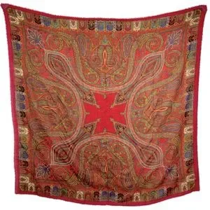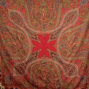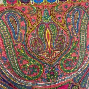 Red, blue, green, burgundy, cream and mustard paisley design with frayed edges. Made In Italy.