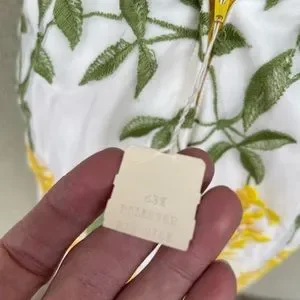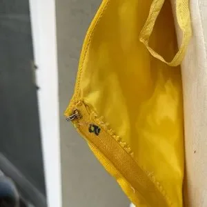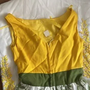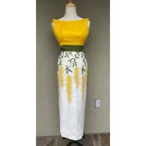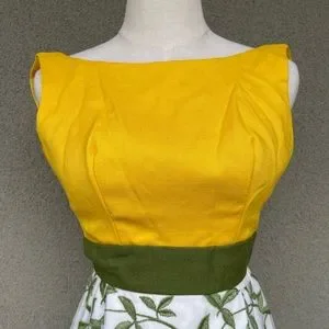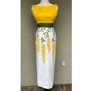 Stunning deadstock vintage late 1950s maxi dress. Original hang tag showing fabric content still attached. No other size/brand/care labels attached. Absolutely pains me to list this but I just have too many gowns. Yellow linen top with an organza over linen bottom. Organza has detailed floral embroidery front and back. Bateau neckline.