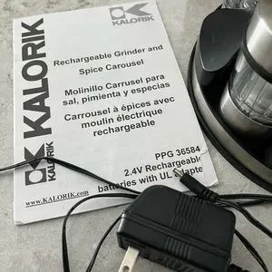 Kalorik grinder and spice carousel, 5 spice grinders, cord to recharge, manual, black-stainless steel. Like new
