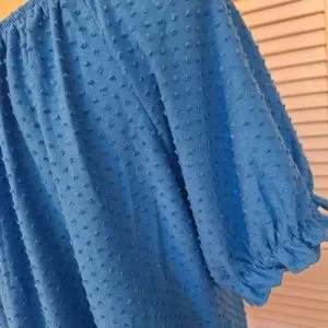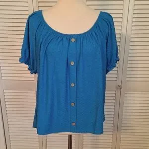 beautiful chenille blouse from philosophy. pullover with button details and ruffle sleeves. color is seafarer blue. size is large. armpit to Armpit is 22", shoulder to hem is 24". size is large. New with tags.