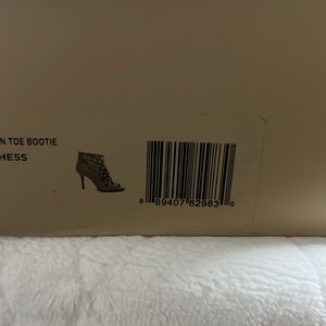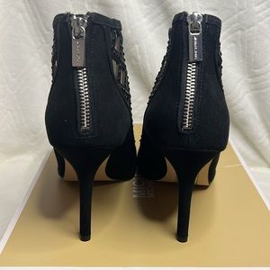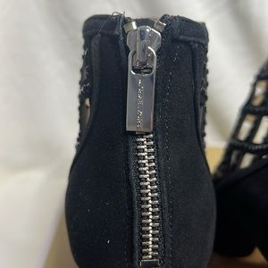 MK Yvonne Open Toe bootie. Black suede. Caged front with sequins/jewels. 3 1/2 inch heel.