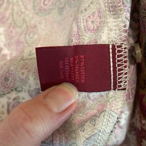 212 Collection Paisley 3/4 Sleeve Blouse in beautiful shades of pink/green/tan, size M. Very good pre-owned condition. 97% cotton; 3% spandex, so it has light stretch for comfort. 3/4 length sleeves have two buttons at the cuffs for improved fit. Blouse features a V-neck and darts on the front, back, and at the bust for a great feminine shape. The fabric is not see-through, so it's perfect for work. No tears, stains, or missing buttons.