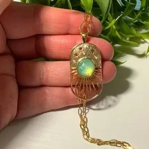 New fashion jewelry pendant with faux opal bezel set stone. Gold tone metal pendant measures 1 3/4” in length and 3/4” in width. Delicate paperclip style gold tone chain measuring 29” in length. Lobster clasp. Includes gift box!