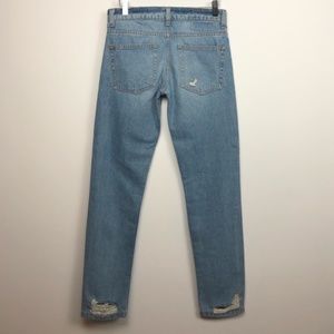 - High Waist Mid Blue Wash Distressed Denim