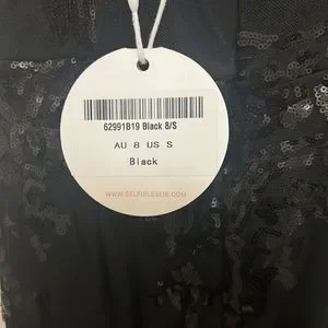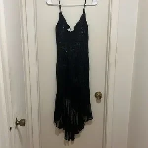 High low black sequence dress with adjustable straps and a zipper back.