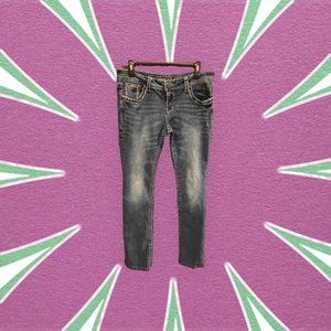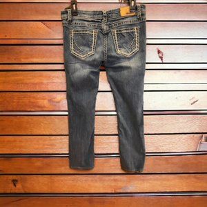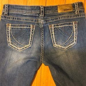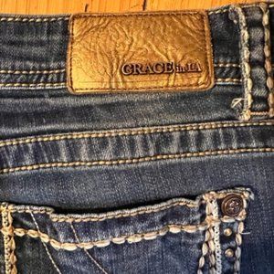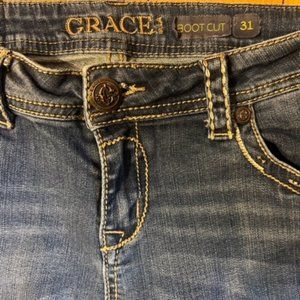 Grace in LA Women's low-rise, heavy stitch/embroidery, crystal embellished pockets, bootcut stretch jeans. Super comfortable, lightly distressed with 5 pockets. Size 31 - 28.5" inseam.