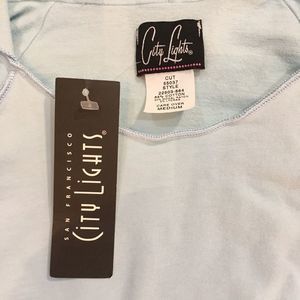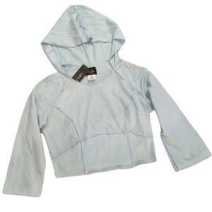 City Lights San Francisco powder blue hooded crop long sleeve shirt. Cotton/rayon/lycra blend. Measurement from center front to hem is 13 1/2 inches. Reverse seams. Dead stock with tags still on the garment. Workout
