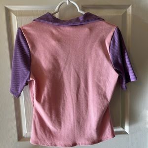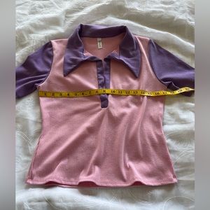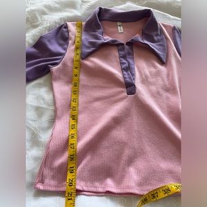 GoodTime USA 2-Piece XL Pink/Lavender Jump Suit. Top is Short Sleeve Ribbed ButterFly Collared V-Neck. Bottoms have elastic Waist Band, ribbed and Flared Legs. Strings are not Draw String.