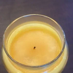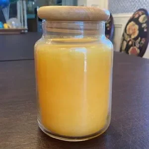 22 oz. Very slightly burned- majority of wax still intact jar. Still smells great and color still even. Wooden lid.