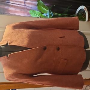 2 button closure. Pockets still sewn shut. Velvet trim around neck and on pockets.