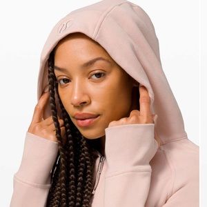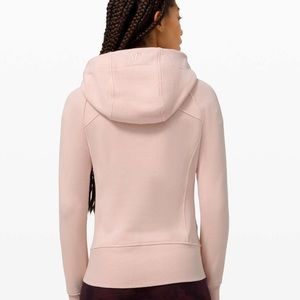 Lululemon Scuba Hoodie in feather pink. Zipper front, thumb holes, front pockets. Almost new condition. Size 8. Last two photos are the actual hoodie. Other photos are actual color.