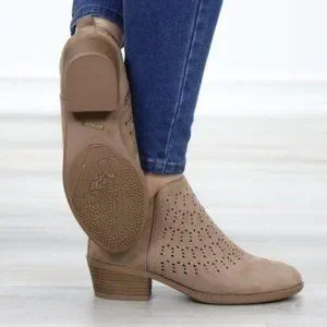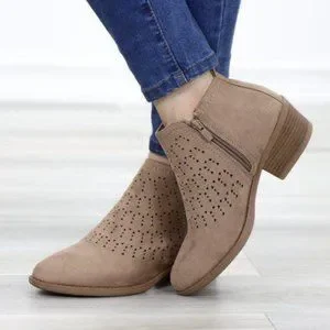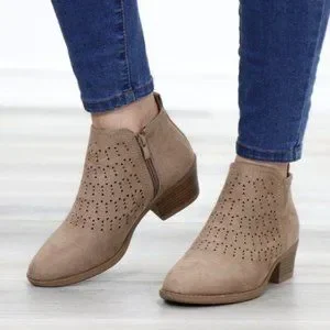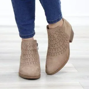 Boho Ankle Boots Taupe Suede Booties Low Heel Laser Cut Design With Zipper