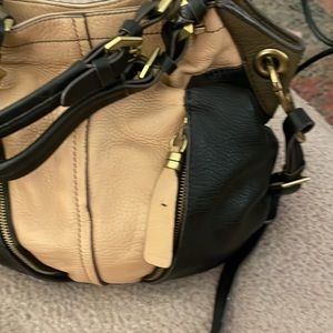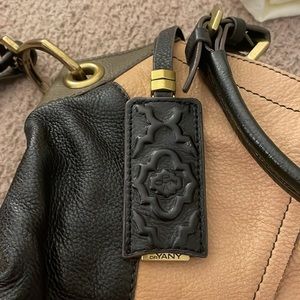 orYANY cream and black Tote with Handles and Shoulder Strap. Zipper detail
