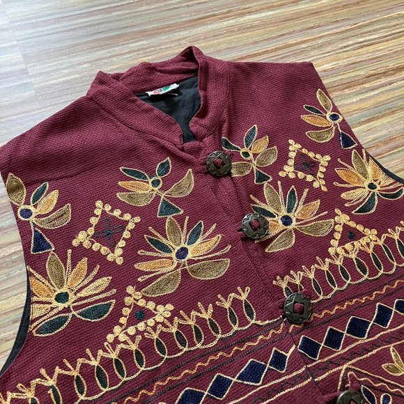 Folk Art Embroidered Burgundy Vest with Metal Concho Buttons Boho Made in India