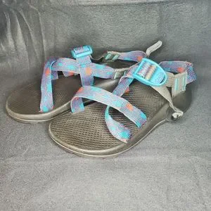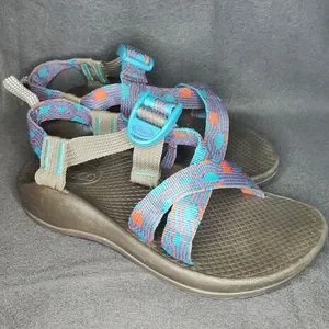 Womens size 5 Chaco sandals with blue and orange pattern straps.