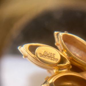 Vintage signed Alice Caviness gold toned and brilliant rhinestone dimensional brooch and clip on earrings. Brooch measures 4 1/2 inches long by 1 1/4 inches wide by 1 inch tall. Clip on earrings measure 1 1/4 inches by 3/4 inch by 3/4 inch.