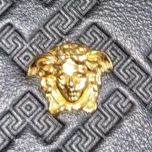 Authentic Versace Black Leather Wristlet Clutch, Gold Hardware 6.5"(L) x 10"(W), new condition with gold outside zipper, pulls, removable wristlet clasp and the iconic Versace Medusa Emblem on front. Purchased at the Venice, Italy boutique in 2017. Comes in original box with dust bag.