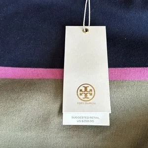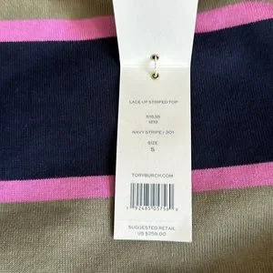 NWT Tory Burch Lace Up Striped Top. Still has protective pieces on lace up ties. Colors are navy, purple and army green. So stylish. Size Small.