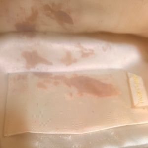 This was bought in the 1960s and I used it for nearly every formal dance in high school. It is beaded solidly on the front and back with a flower design made up of bugle beads on the front. I must have spilled some make up back in the day because they’re stains from make up. I’ve taken a close-up of two areas that are missing some beads. I believe these are hand beaded because the other beads nearby do not fall off. The clasp works perfectly and the gold chain is not discolored.