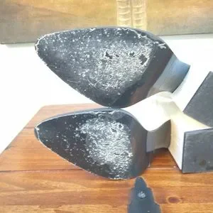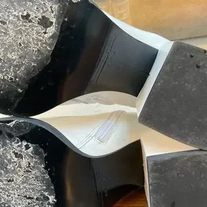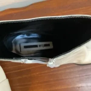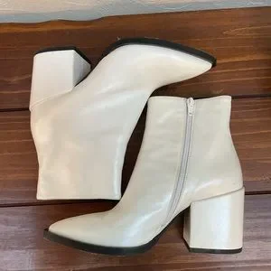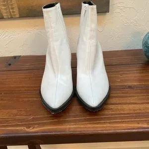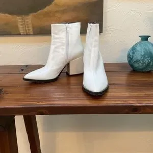 Soft white leather booties with block heel and side zip. There are slight scuffs, but can be polished off. The bottoms have the remaining plastic protective covering, but will wear off. I’ve worn these twice. They’re incredibly chic and be styled many ways 3” heel, 4 3/4” shaft.