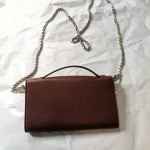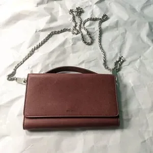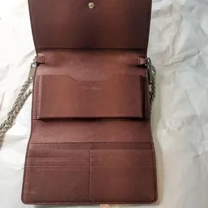 Rick Owens brown leather wallet on a chain. Logo outside, inside and on metal chain clasps.