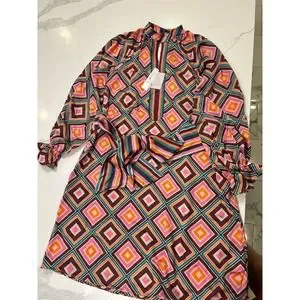 Embrace the allure of the Trina Turk Sunburst Dress, a statement piece designed for instant femininity and dramatic flair. This drapey shirtdress features a high banded collar with a front keyhole, long balloon sleeves with ruffle cuffs, and gathered shoulders for a touch of elegance. The adjustable and removable sash tie belt allows for versatile styling. The contrast stripe collar, belt, and placket add a bold visual impact, making it a perfect ensemble for fashion-forward weekends in the city. With an MSRP of $448, this shirtdress brings sophistication to your wardrobe. Crafted from Brookhaven Blocks Satin Georgette with contrasting Brookhaven Stripe Satin Georgette, it showcases the quality and style Trina Turk is renowned for. The shirtdress silhouette with a length of 41" ensures a flattering fit. Runs true to size, and the model, standing at 5'10", is wearing size S. Elevate your look by pairing it with heels and our matching tote handbag. Dry clean only. Imported.