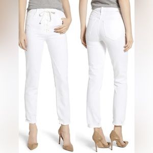 MOTHER likes to spice up her white skinny jeans with a laced-up fly, distressed details and a chewed-up hem