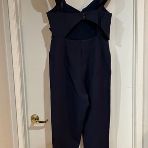 Navy blue strappy formal jumpsuit, with partially open back and one asymmetrical off-the-shoulder accent strap. Size Large.