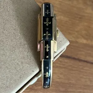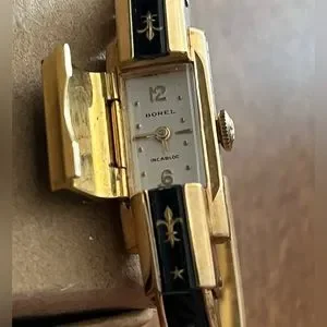 Authentic Antique Vintage Ernest Borel Incabloc Cuff Watch with Gold Fleur Di Lis Insignia and inlay. Made in Switzerland. Very rare collectors piece.