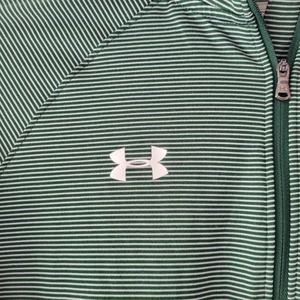 Under Armour Women's Heatgear 1/4 Zip Green Striped Pullover Top. Size Small. Loose fit. 100% Polyester. Logo in front. Approximately 25" Inseam 19" Pit to pit. Flat lay measurements. In excellent used condition.