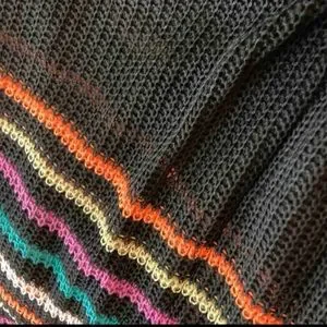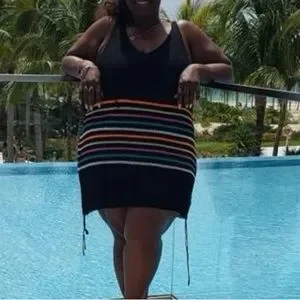 Lovely knit coverup dress with multicolor stripes and adjustable drawstring sides. The black crochet provides coverage without being hot. The low back allows your suit to dry even if you’re ready to get out of the sun. The perfect coverup for your next vacation or vacation pool party!