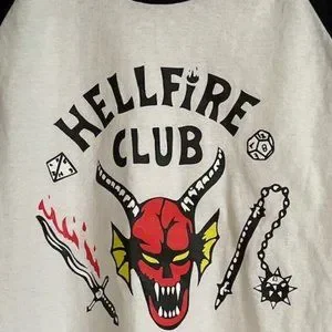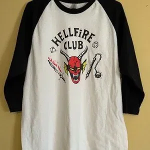 Get ready for the last season of Stranger Things by wearing your own Hellfire Club shirt! Size large. Unworn. No tears, stains or rips. PERFECT FOR ALL FANS! Men or Women.