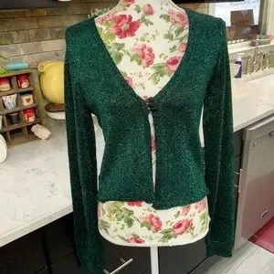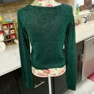 Elevate your wardrobe with this stunning emerald green metallic cardigan sweater by Free People. The tight-knit pattern provides a shimmer effect that adds a touch of glam to any outfit. The V-neckline and regular long sleeves make it a versatile piece suitable for any occasion, whether it be a casual outing or a formal event.
