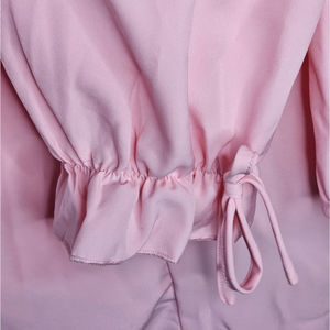 Elegant, feminine, soft girl vibes blush pink blouse with black lace across the upper chest & upper arms with eyelet detailing on the chest. Buttons come down to about mid chest. Flounce sleeves that can be tightened at the wrists give the arms a sweet, billowy effect. Made of 100% polyester.
