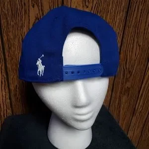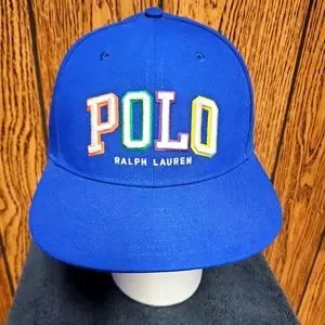 Royal blue w/ multi-colored large lettering. Adjustable snap-back.