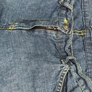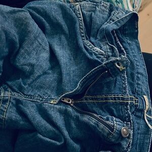 Front pocket, back flap pockets, zip fly with button closure, non stretch fabric. They have the appearance of jeans but I don’t think they are actual jean material